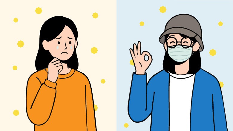一般的なマスクを着けることで約70%、花粉症用のマスクであれば約84%も花粉の吸引が減少されるといわれています。顔にフィットし、呼吸しやすいもの、かつ衛生面を考慮すると使い捨てのものがおすすめです。